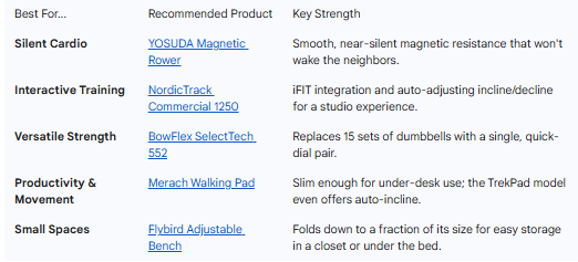 If you are starting out with limited space, the Flybird Bench and BowFlex 552s provide a professional-grade strength foundation with minimal floor space. For heart health and endurance, the YOSUDA Rower offers the best value for a full-body workout. The NordicTrack 1250 is the premium choice for runners who want variety and coaching.